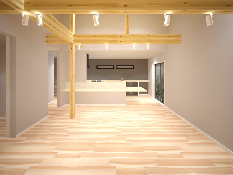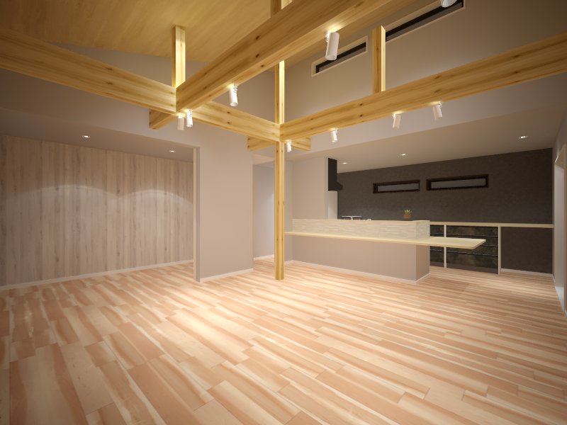 無垢の梁が印象的な開放感あふれるリビング空間。