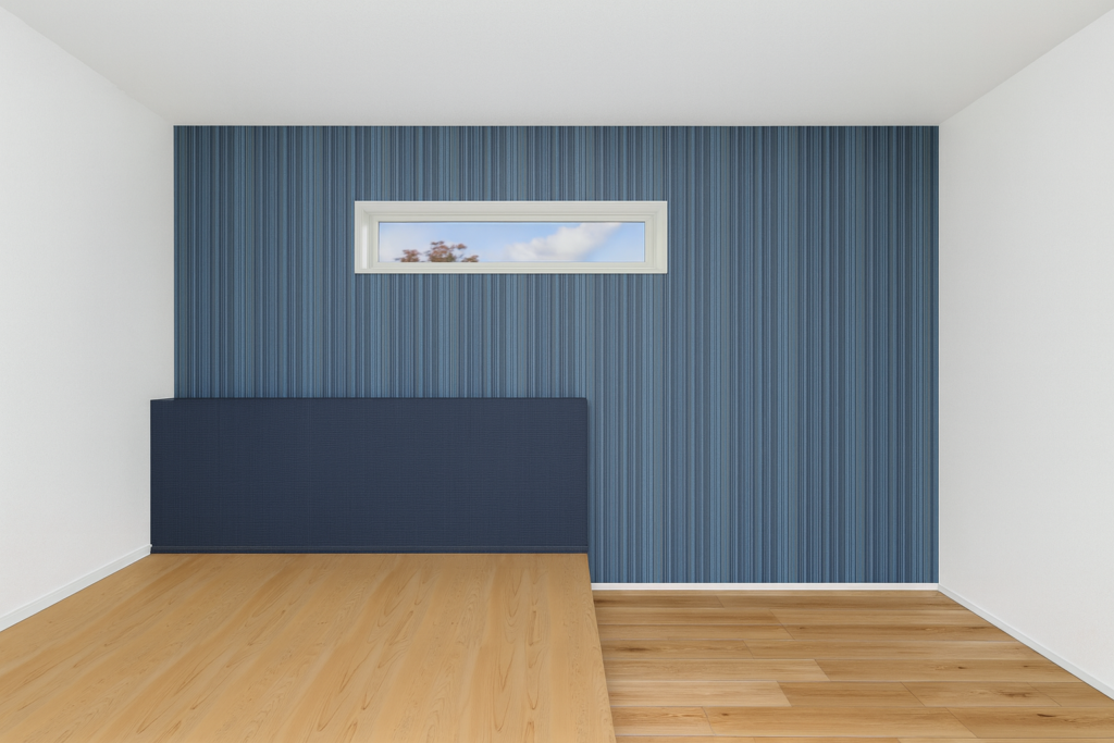 アクセントクロスが存在感を放つ寝室には、小上がりを配置。