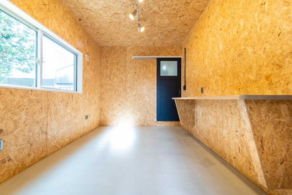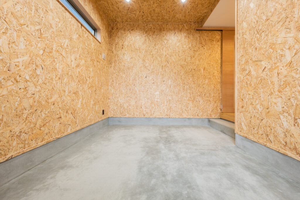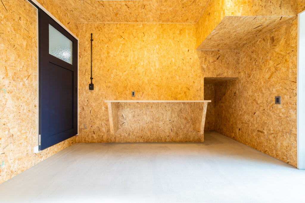 外からも室内からもいける5.6帖の土間をOSB合板で仕上げた事例。