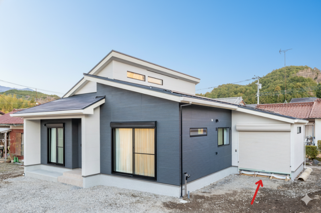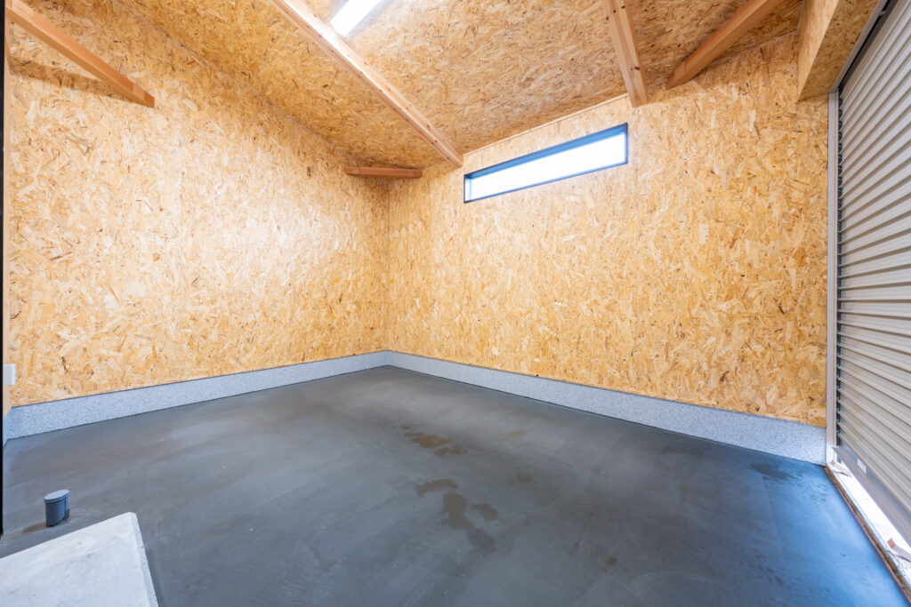電動で開くシャッターを取付けた、7.8帖の車庫。