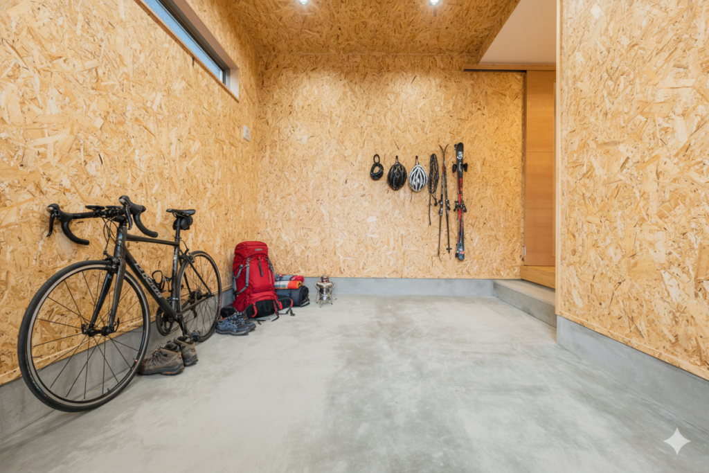 アウトドアやサイクリングがお好きな家族の収納場所です。