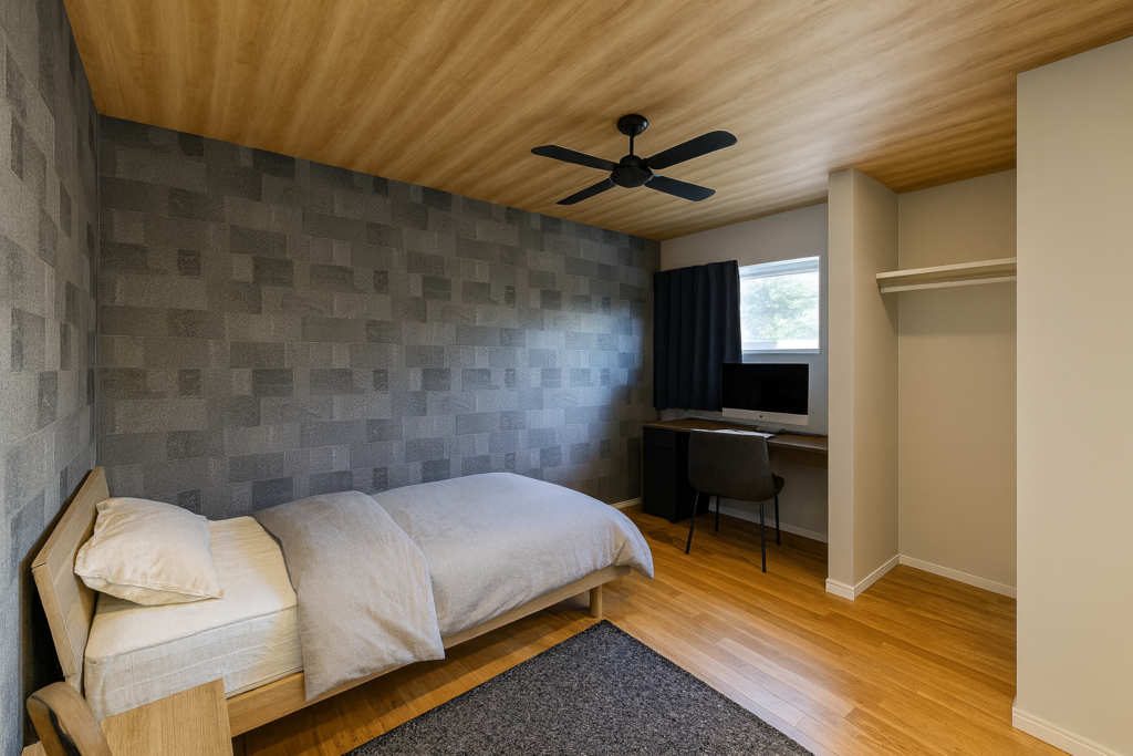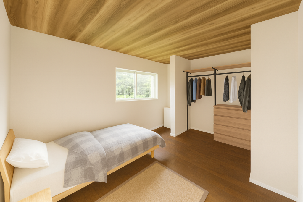 ご夫婦それぞれのお部屋に収納スペースを設け、窓際をちょっとしたPC作業スペースにしました。
